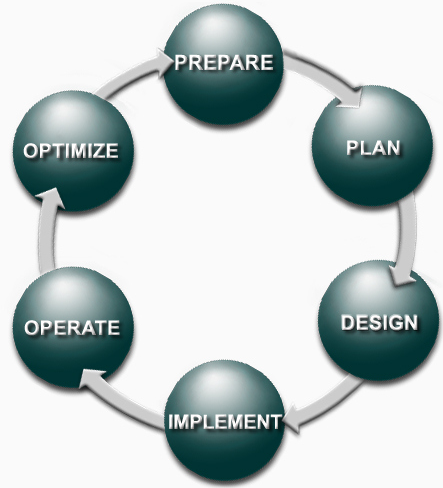 This is the network lifecyle. Each phase builds up to the next phase and provides a roadmap of how a network should be implemented, designed and upgraded.
